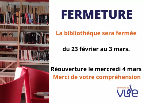 Fermeture de la bibliothèque municipale du 23 février au 3 mars. Réouverture le mercredi 4 mars.