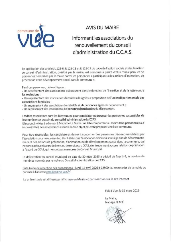 Au secrétariat de la mairie ou par mail à l’adresse ccas@mairie-vue.fr