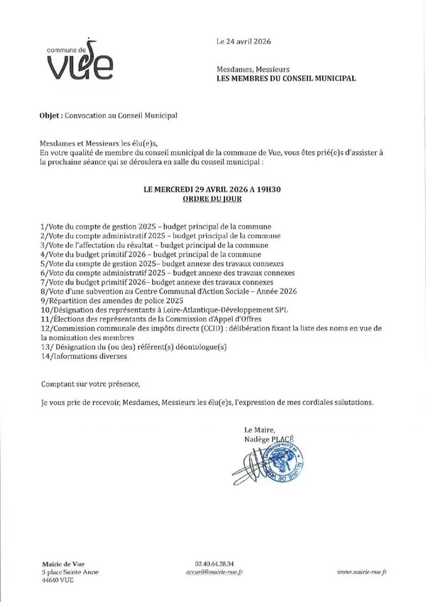 Conseil Municipal le 29 avril 2026